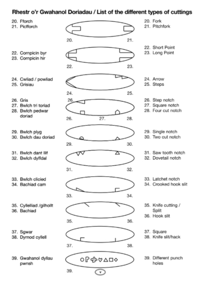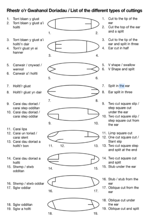(iii) Disgrifir y ddwy glust fel y gwelir hwy wrth ddilyn y ddafad. Y glust dde (fel yn sefyll tu ôl i’r anifail) a ddisgrifir yn gyntaf bob amser, gan